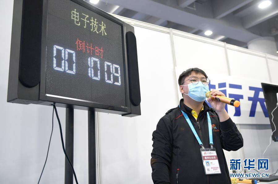 第一届全国职业技能大赛在广州举行,梁攀作为电子项目裁判长助理,在比赛即将结束时进行倒计时播报(2020年12月10日摄)。