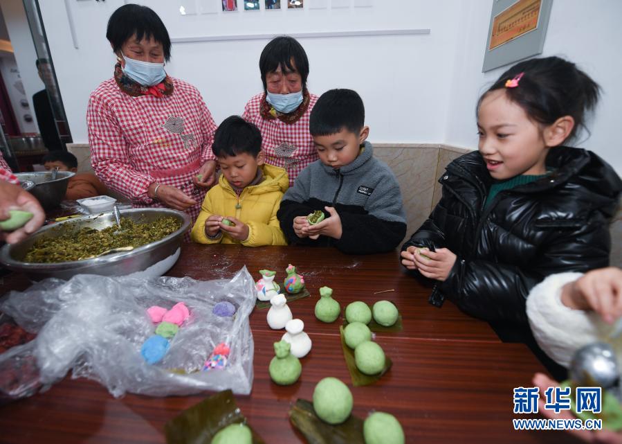1月5日,当地居民带着孩子们一起制作糯米青团和“欢喜团”。