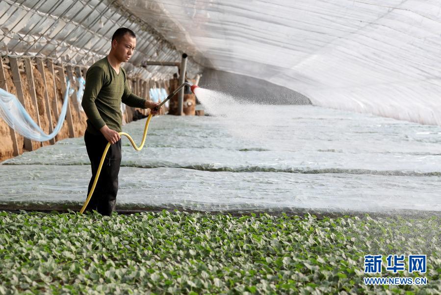 1月5日,河北省阜城县康美瓜菜种植合作社的农民在育苗温棚内为西瓜秧苗浇水。