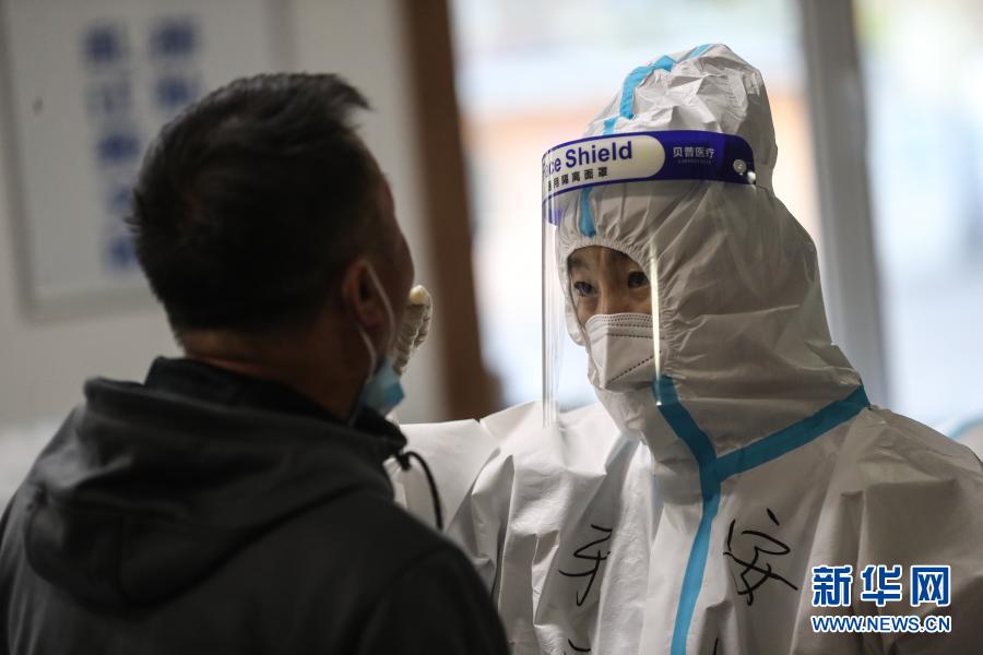 1月5日,医护人员在沈阳市和平区马路湾街道振兴二校核酸采样点进行核酸采样。
