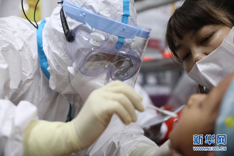 1月5日,在沈阳市苏家屯区民主街道河畔社区第一检测点,检测人员为小朋友进行核酸采样。
