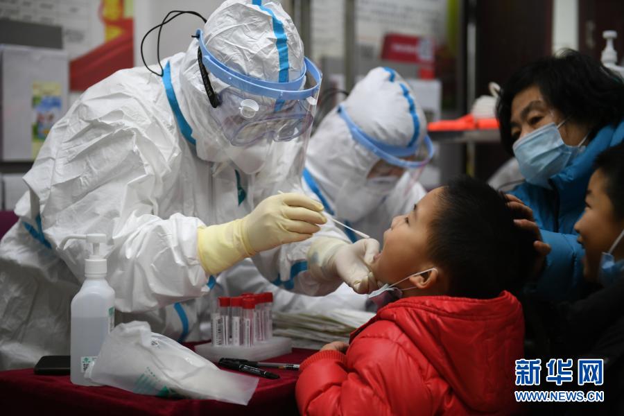 1月5日,在沈阳市苏家屯区民主街道河畔社区第一检测点,小朋友接受核酸采样。