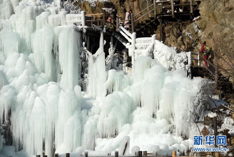 近日,济南九如山度假风景区依托原有的八潭九瀑旅游资源,通过引流形成多处造型各异的冰瀑群,吸引不少游客前来欣赏。