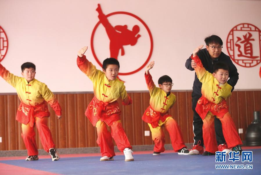 1月5日,山东省青岛市通济实验学校的学生在武术课上练习。