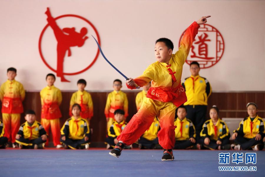 1月5日,山东省青岛市通济实验学校的学生在武术课上练习。