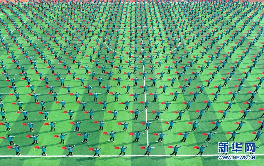1月5日,山东省青岛市通济实验学校的学生在大课间打太极扇(无人机照片)。