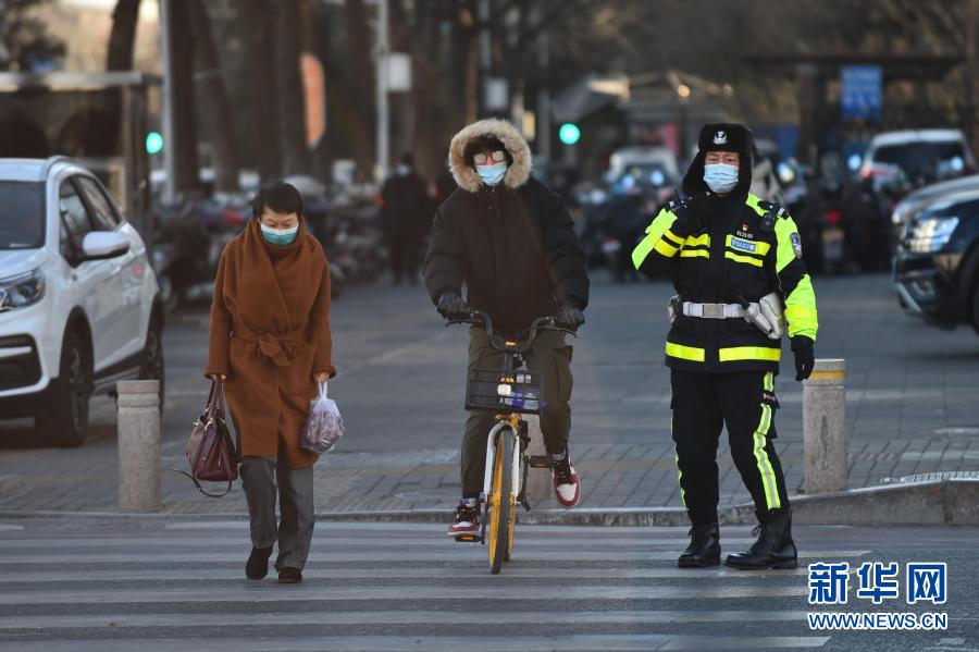 1月6日,在北京长椿街路口,西城区交通支队民警李宁(右)在执勤。新华社记者 彭子洋 摄