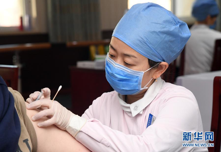 1月6日,在北京市海淀区花园路街道临时接种点登记注射室,医护人员为接种人员注射新冠疫苗。新华社记者 任超 摄
