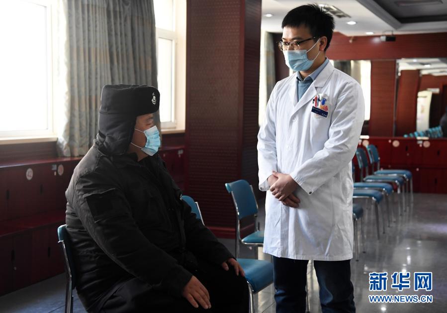 1月6日,在北京市海淀区花园路街道临时接种点,医护人员(右)在留观室询问社区工作者李广宇接种后的身体情况。新华社记者 任超 摄
