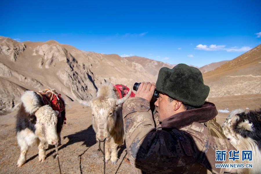 叶城二牧场三连职工阿卜力米提·阿卜拉观察巡边路上的情况(2020年12月25日摄)。新华社记者 胡虎虎 摄