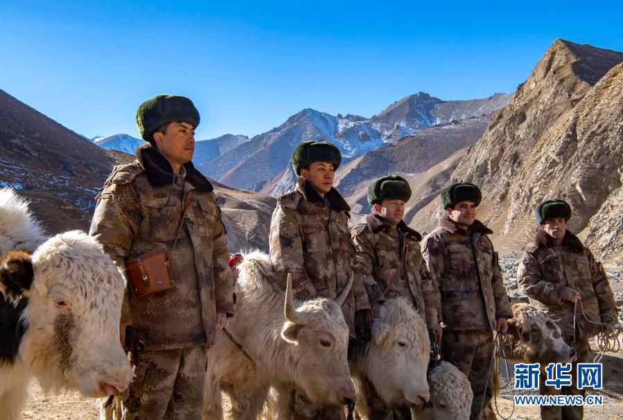 2020年12月25日,参与巡边的“牛人”团队成员合影。左起分别为:阿卜力米提·阿卜拉、李宏炯、亚森·亚亚、吐迪斯衣提·艾麦提、阿布杜麦提·土荪麦麦提。新华社记者 胡虎虎 摄