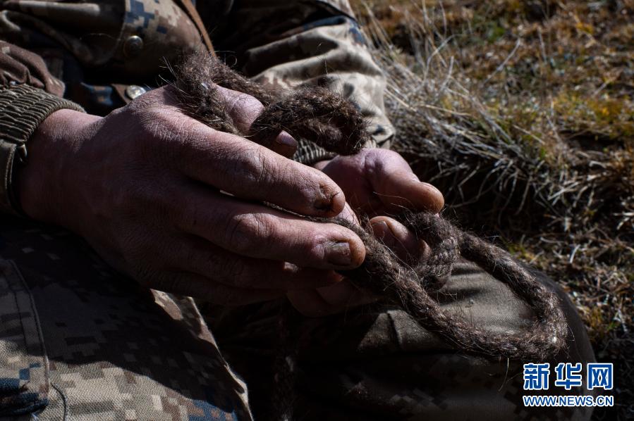 一名参与巡边的队员手握缰绳(2020年10月7日摄)。常年在高寒地带放牧、巡边,风霜已在他手上留下痕迹。新华社记者 胡虎虎 摄