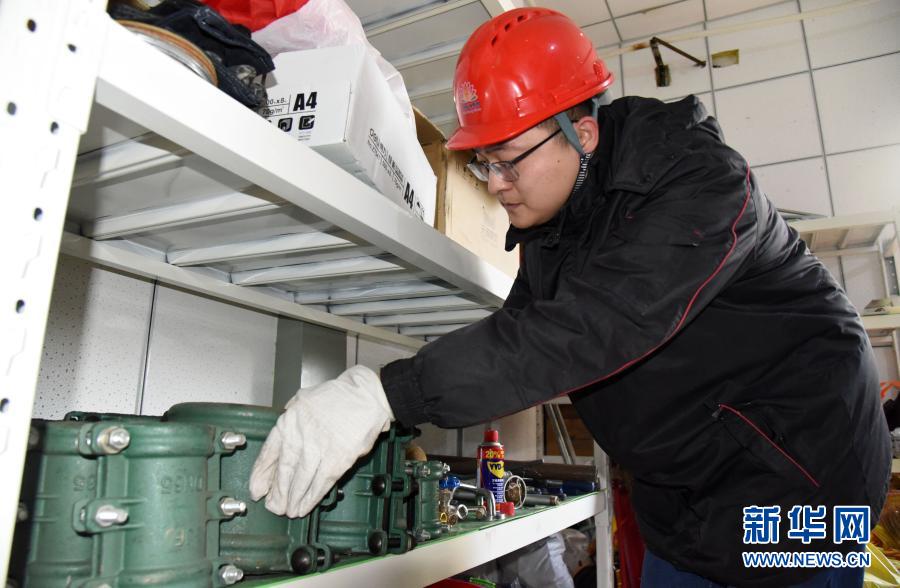 1月6日,济南能源集团所属济南热电腊山分公司工作人员在一处居民小区换热站检查整理应急供热抢修设备。
