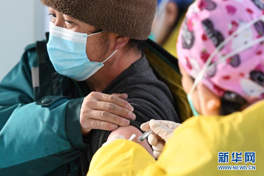 1月6日,在北京市海淀区中关村街道临时集中接种点,医务人员为中国邮政双榆树营投部的邮递员曲长城接种新冠疫苗。