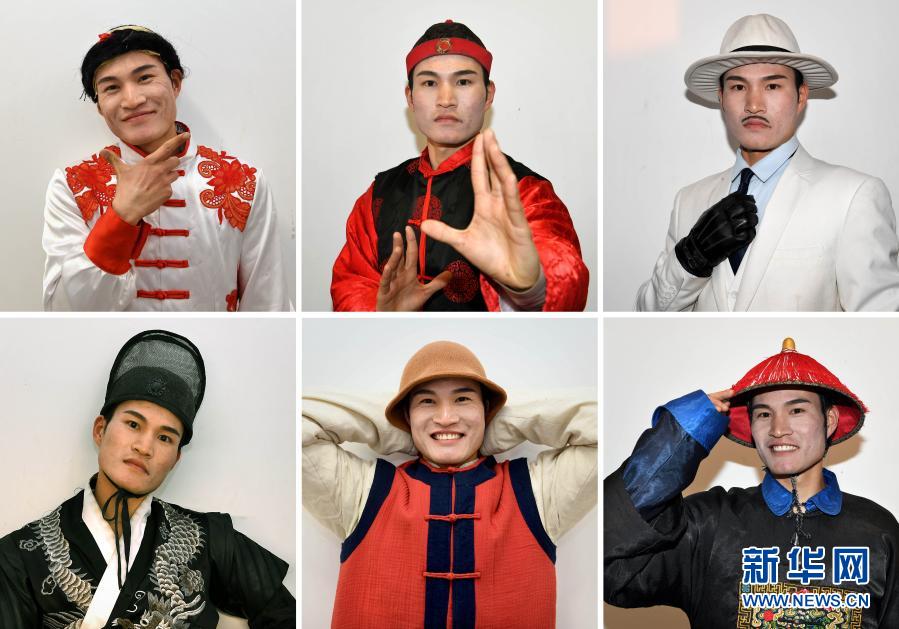 这是周鑫穿着表演服的肖像,他一天要饰演六个角色(拼版照片,1月5日摄)。
