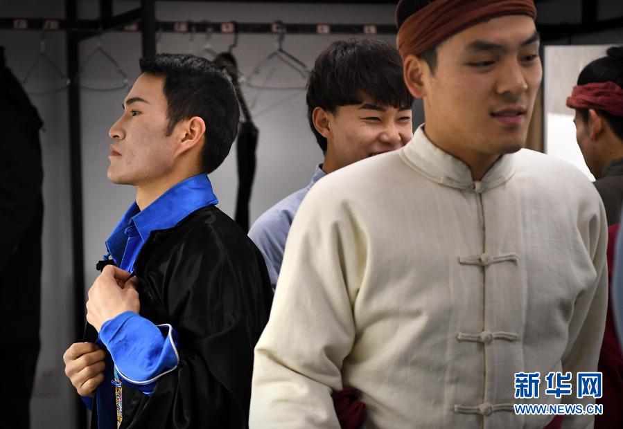 周鑫(左)在电影小镇的服装间里换表演服(1月5日摄)。新华社记者 李安 摄
