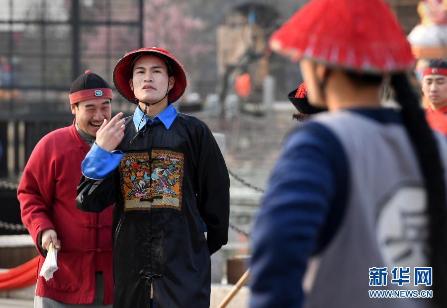 周鑫(左二)在电影小镇里为观众表演(1月5日摄)。新华社记者 李安 摄