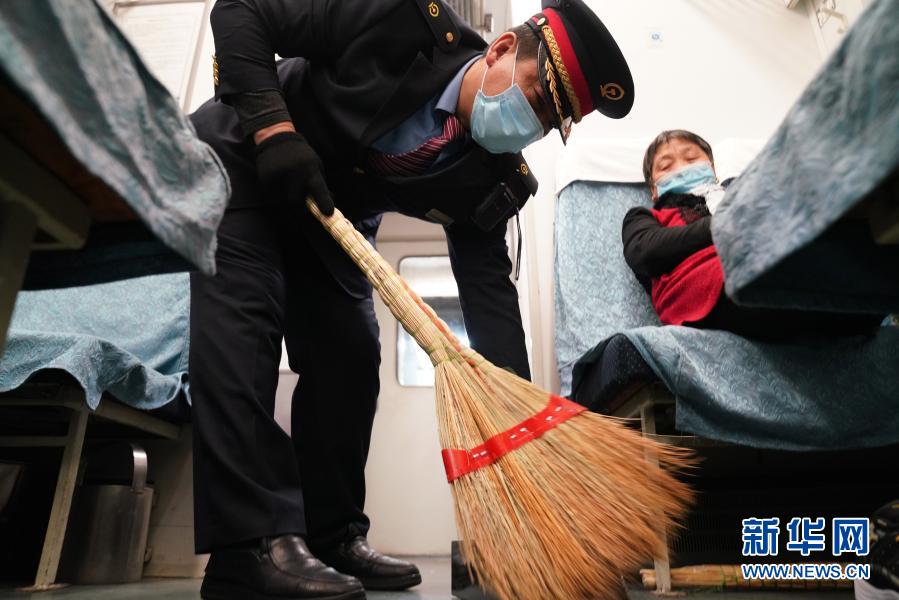 在K7093次列车车厢内,列车员在清扫地面(2021年1月6日摄)。新华社记者 王建威 摄