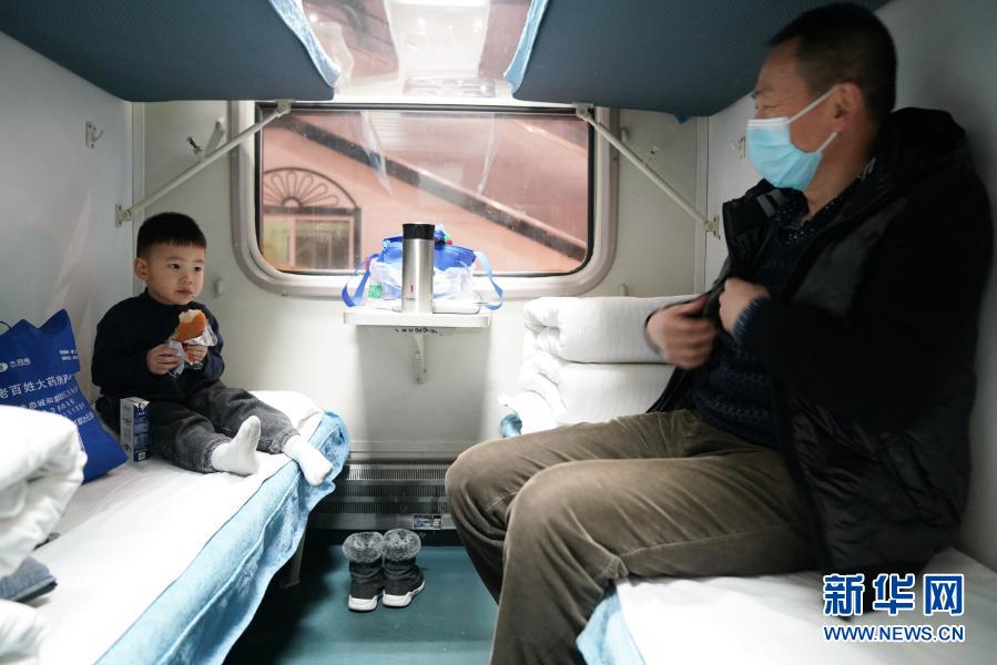 在K7093次列车车厢内,一位家长带着小朋友乘车(2021年1月6日摄)。新华社记者 王建威 摄