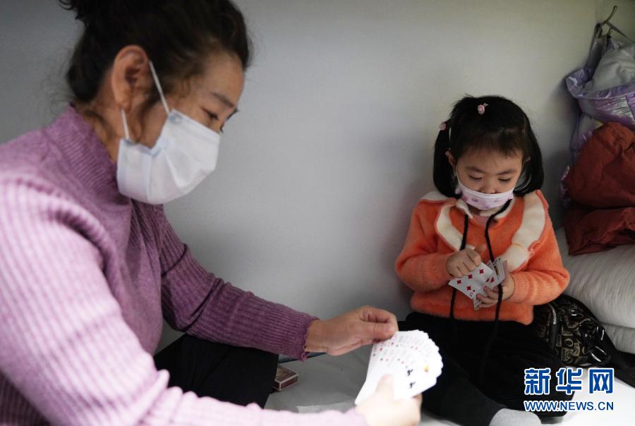 在K7093次列车车厢内,一位家长和小朋友玩牌(2021年1月6日摄)。新华社记者 王建威 摄