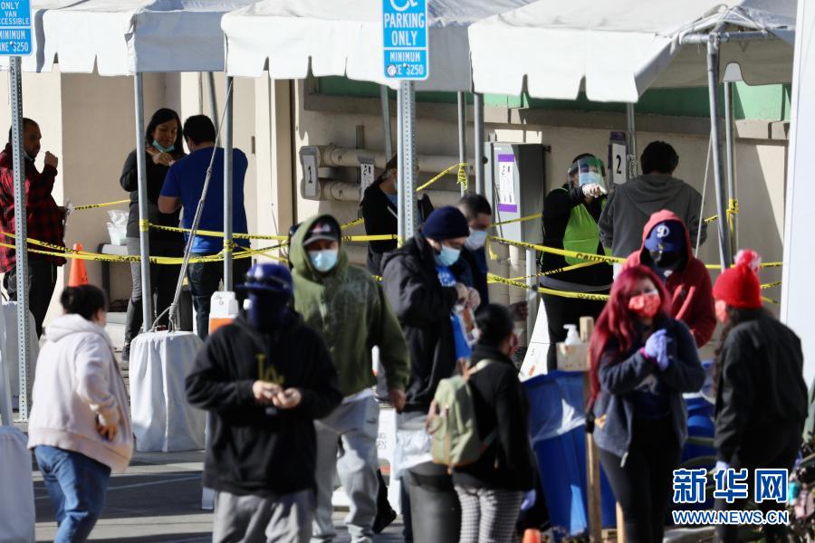 1月6日,在美国加州洛杉矶的一处新冠病毒检测站,民众排队等待检测。