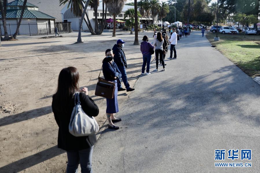 1月6日,在美国加州洛杉矶的一处新冠疫苗接种站,医护人员排队等待接种新冠疫苗。洛杉矶县每天共有18个疫苗接种站开放服务,能为约2千名医护人员接种疫苗。