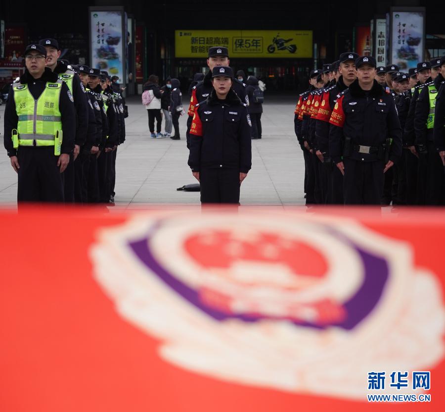 1月7日,在南京南站北广场,民警唱响《中国人民警察之歌》。新华社记者 季春鹏 摄