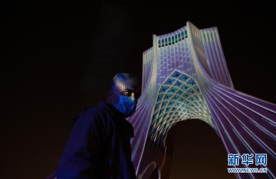 1月6日,在伊朗首都德黑兰,一名男子经过亮灯悼念坠机事件遇难者的地标建筑自由塔。新华社发(艾哈迈德·哈拉比萨斯摄)