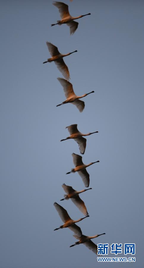 一群白琵鹭在湖南横岭湖省级自然保护区内飞翔(2019年12月2日摄)。新华社记者 陈振海 摄