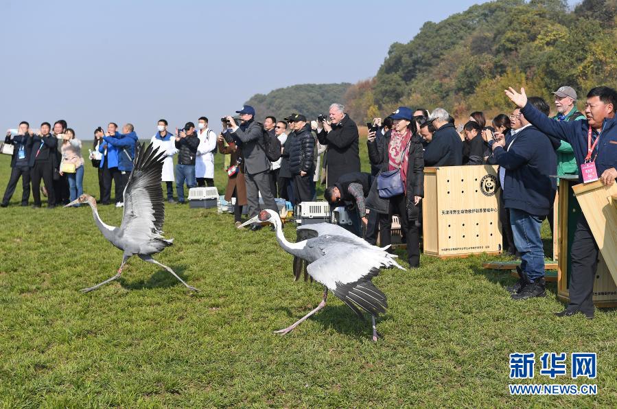 工作人员在江西鄱阳湖国家级自然保护区将两只白枕鹤放飞(2019年12月8日摄)。新华社记者 万象 摄