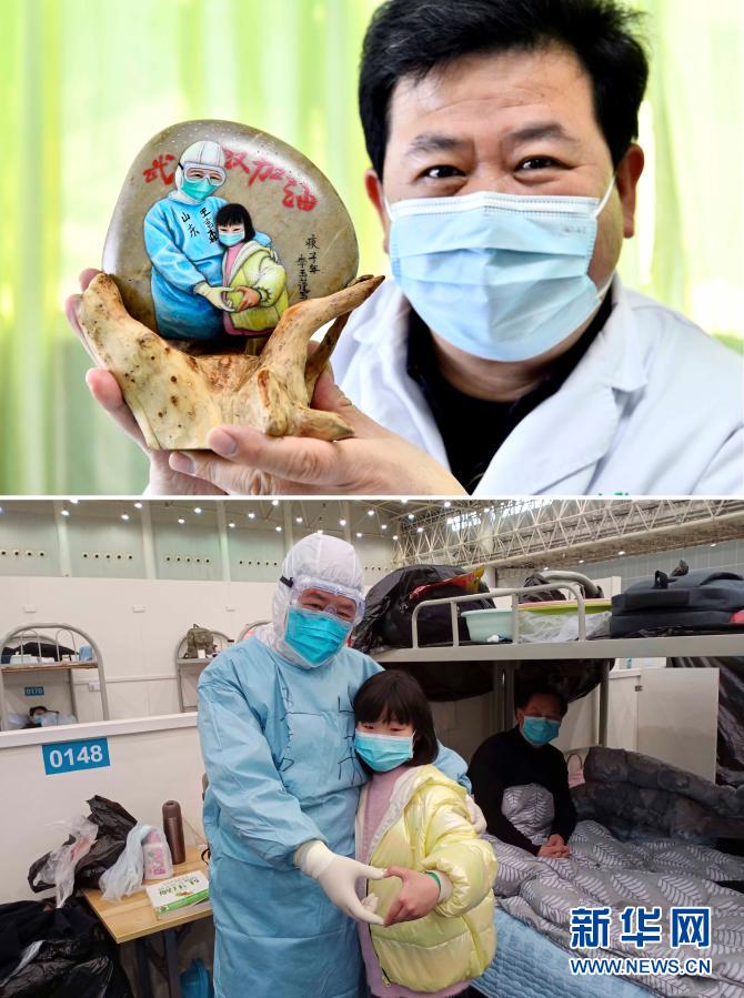 这是一张拼版照片,上图:在山东省立第三医院,援鄂医疗队队员、大内科主任王言森展示彩绘画像(新华社记者郭绪雷2021年1月6日摄);下图:在武汉汉阳方舱医院,援鄂医疗队队员王言森与小女孩比心的合影(2020年2月27日摄,王言森提供)。