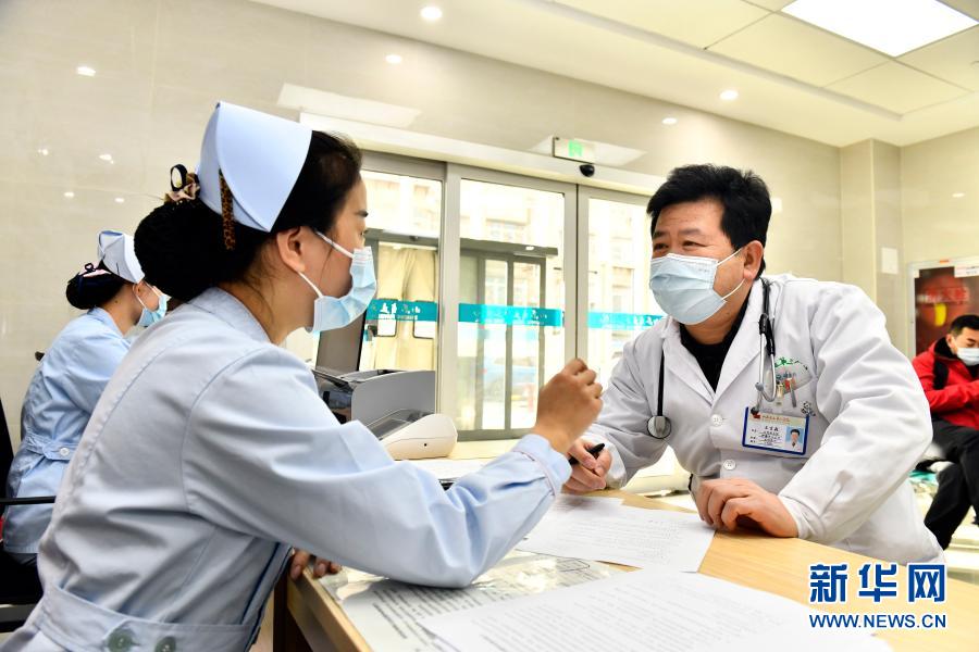 1月6日,在山东省立第三医院,援鄂医疗队队员、大内科主任王言森(右)在接种点准备接种新冠疫苗。