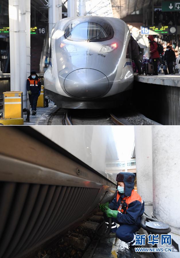 这是一张拼版照片:上图为1月6日,北京西站上水车间一名给水员在进行上水作业;下图为1月6日,北京西站上水车间给水员张长宁在进行上水作业。
