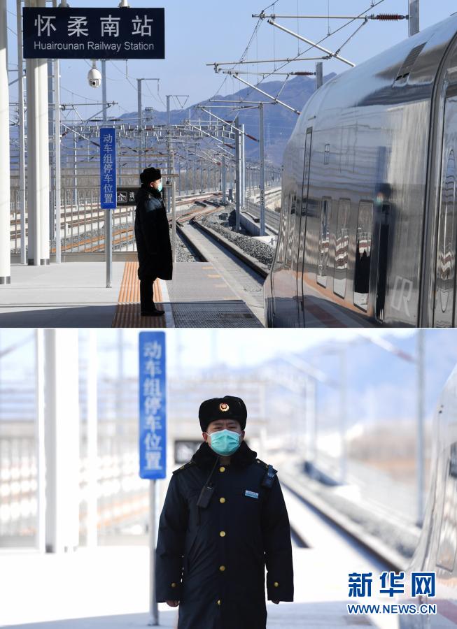 这是一张拼版照片:上图为1月7日,怀柔南站客运员郭东月在怀柔南站迎接试运营列车进站;下图为1月7日,怀柔南站客运员郭东月在怀柔南站值守。
