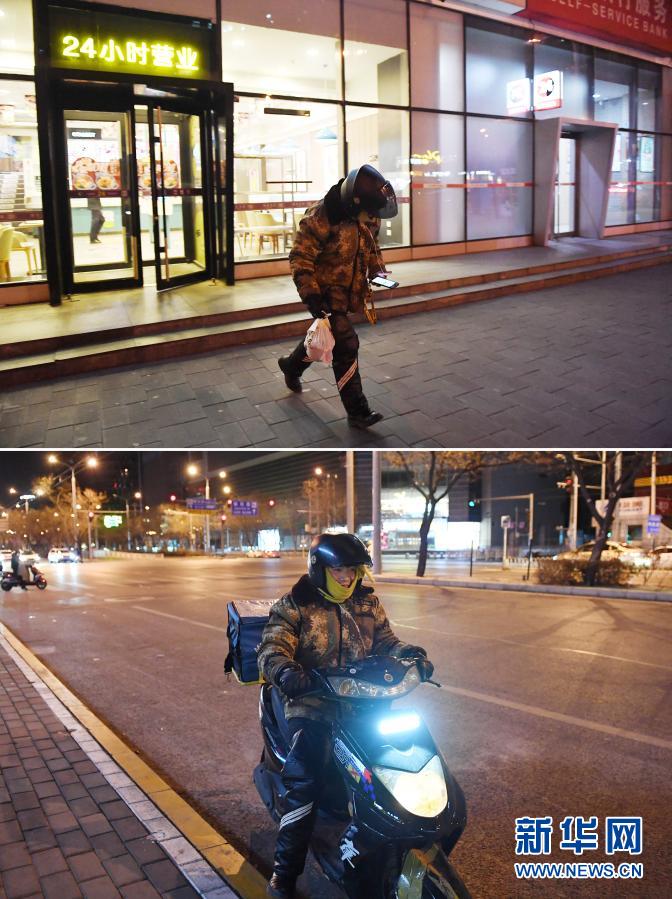 这是一张拼版照片:上图为1月7日凌晨,外卖小哥王佳伟从一家商户取餐出来,顶着寒风查看配送信息;下图为1月7日凌晨,全副武装的外卖小哥王佳伟骑在摩托车上准备出发送餐。