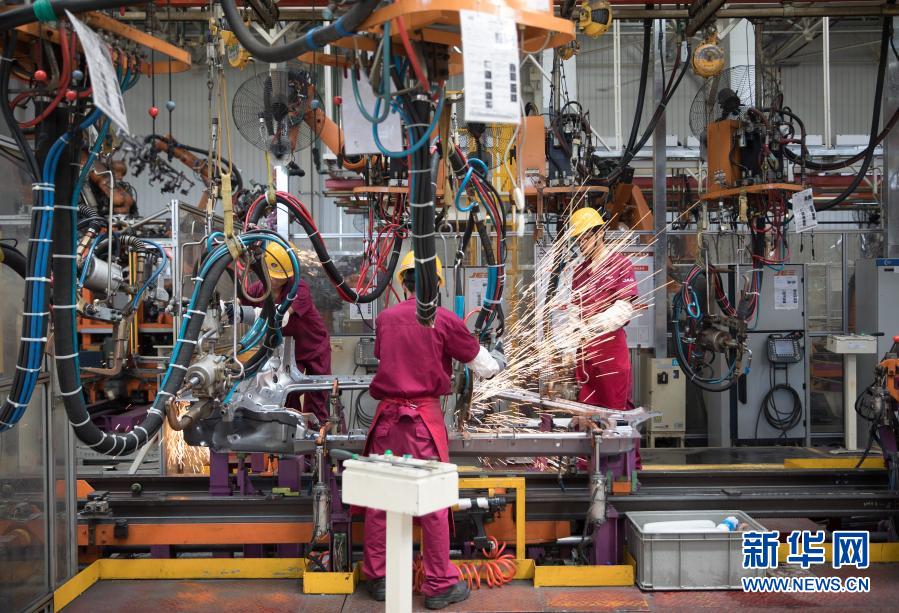在安徽江淮汽车集团股份有限公司安庆分公司新能源汽车生产车间,工人在焊接新能源纯电动车配件(2018年8月7日摄)。新华社记者 金立旺 摄