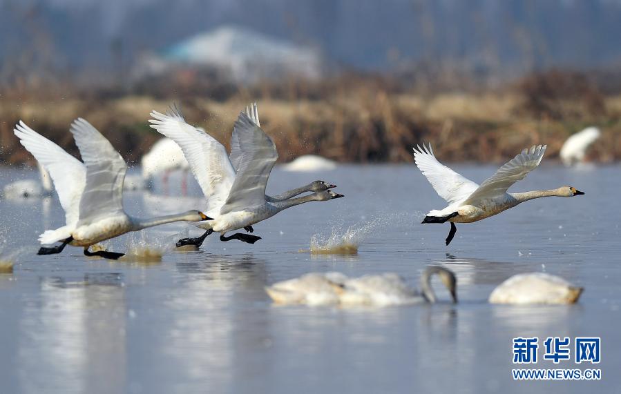 候鸟在位于江西鄱阳湖畔的五星农场境内振翅起飞(2018年1月11日摄)。新华社记者 万象 摄