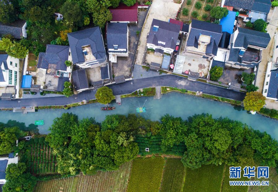 浙江省长兴县龙山街道渚山村车渚港河道内,河长带领专职保洁人员进行日常的乡村河道护理巡查,类似的巡查每周不少于五次(2017年10月12日摄,无人机照片)。新华社记者 徐昱 摄