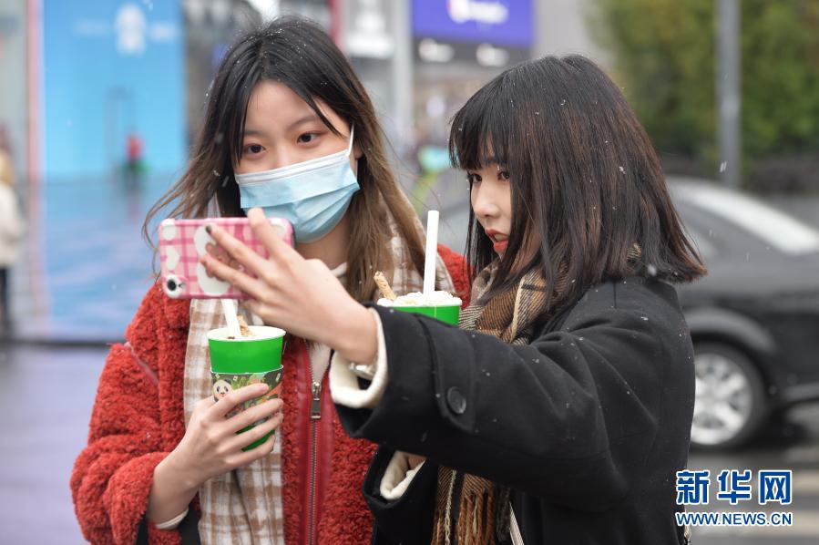 1月7日,市民在成都市区街头自拍。