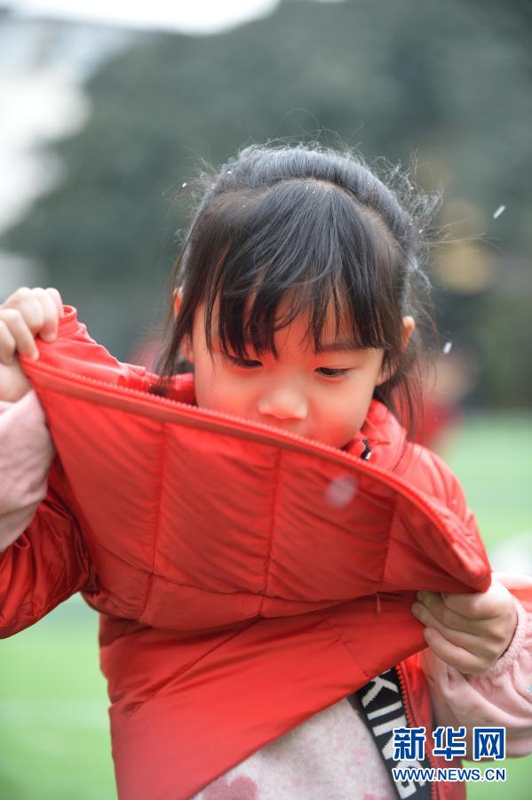1月7日,在成都市龙江路小学分校,一名学生用外套收集雪花。