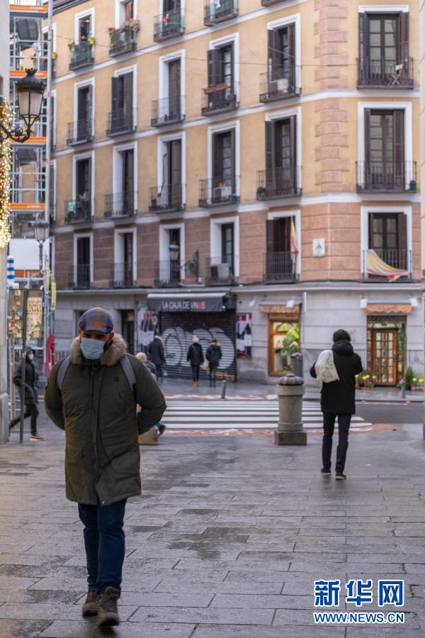 1月7日,一名戴口罩的男子在西班牙马德里马约尔广场附近散步。