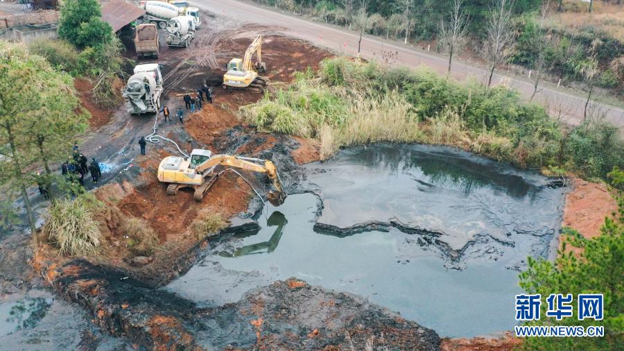 1月7日,在湖南省茶陵县洣江街道诸睦村和建矿业有限公司,茶陵县多部门工作人员在抓紧清理尾矿库的废水和淤泥(无人机照片)。新华社发