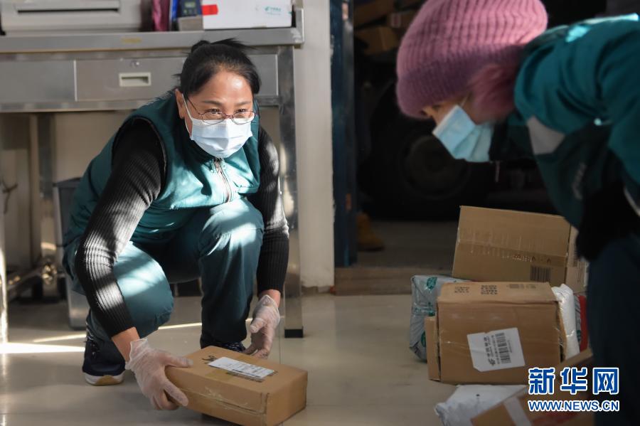 1月7日,在阿尔山市邮政分公司寄递事业部,韩金花(左)与同事一起分拣包裹。
