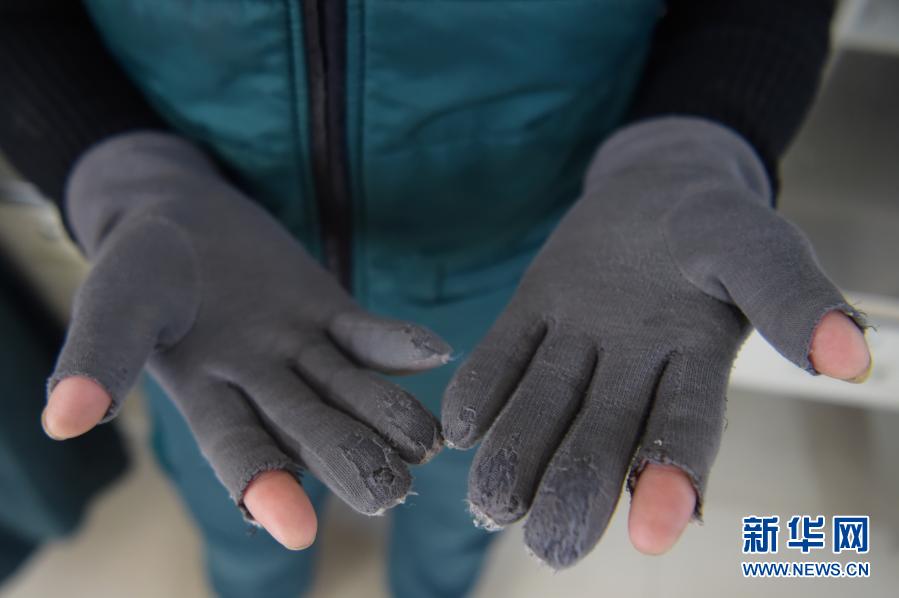 1月7日,韩金花在阿尔山市邮政分公司寄递事业部展示自己的手套。