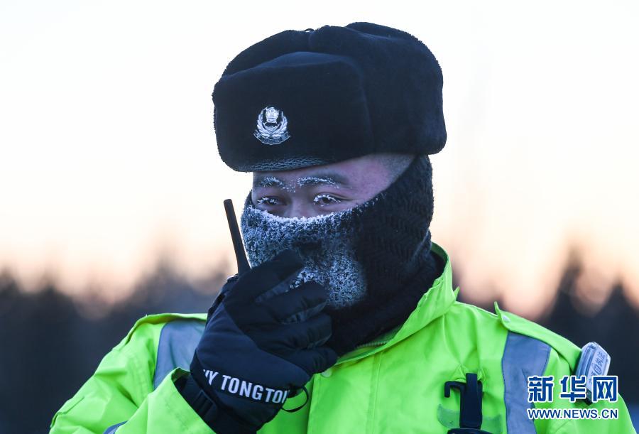 1月7日,内蒙古锡林郭勒盟锡林浩特市公安交警在寒冬中执勤。