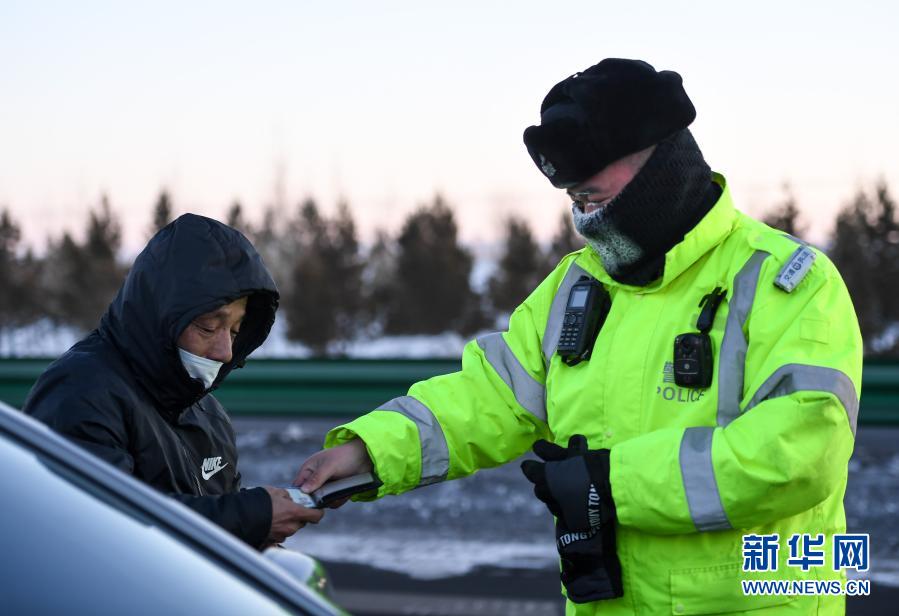 1月7日,内蒙古锡林郭勒盟锡林浩特市公安交警在寒冬中检查来往车辆。