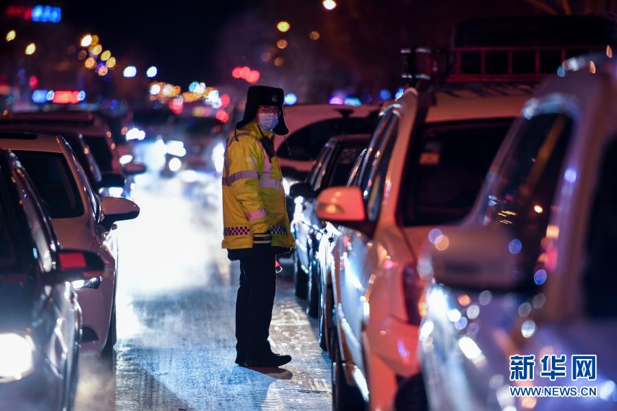 1月7日,内蒙古锡林郭勒盟锡林浩特市公安交警在寒冬中执勤。