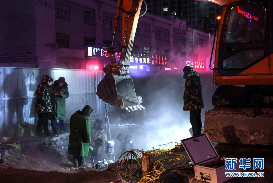1月7日,内蒙古锡林郭勒盟锡林浩特市供热办组织人员在抢修供热管网。