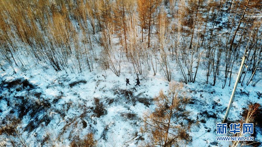 1月7日,呼中供电公司巡线检修工王殿辉和队友孙林波在执行“极寒特巡”任务的巡线途中(无人机照片)。