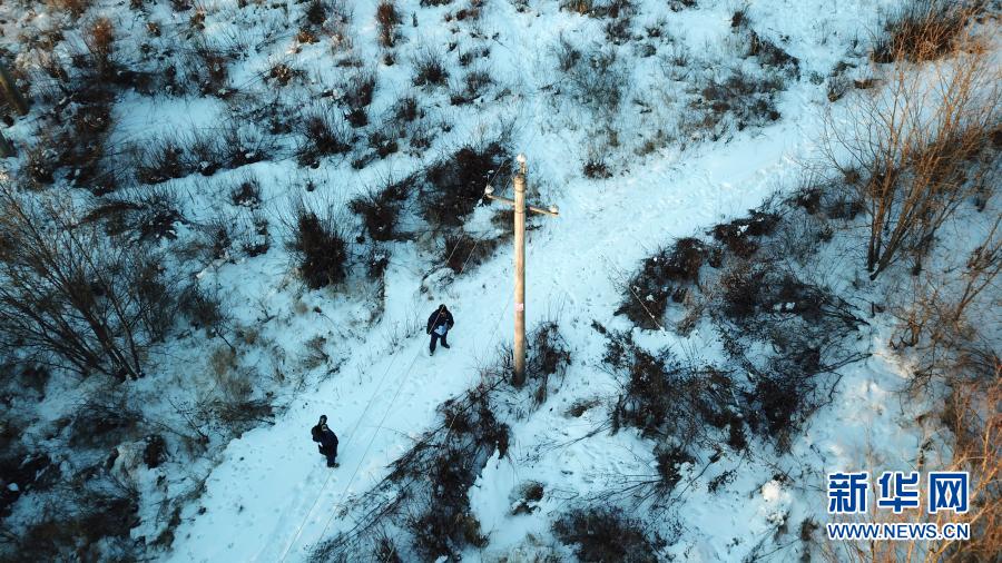 1月7日,呼中供电公司巡线检修工王殿辉和队友孙林波在执行“极寒特巡”任务的巡线途中(无人机照片)。